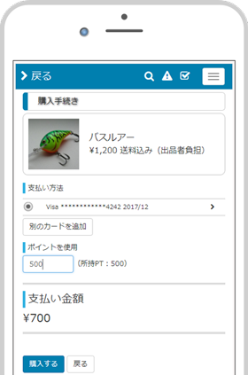 ポイントでも購入できる クレジットカードで商品を購入できる他、 出品した商品が売れたときの売上金をポイント交換すれば、 そのまま商品を購入することができます。 |